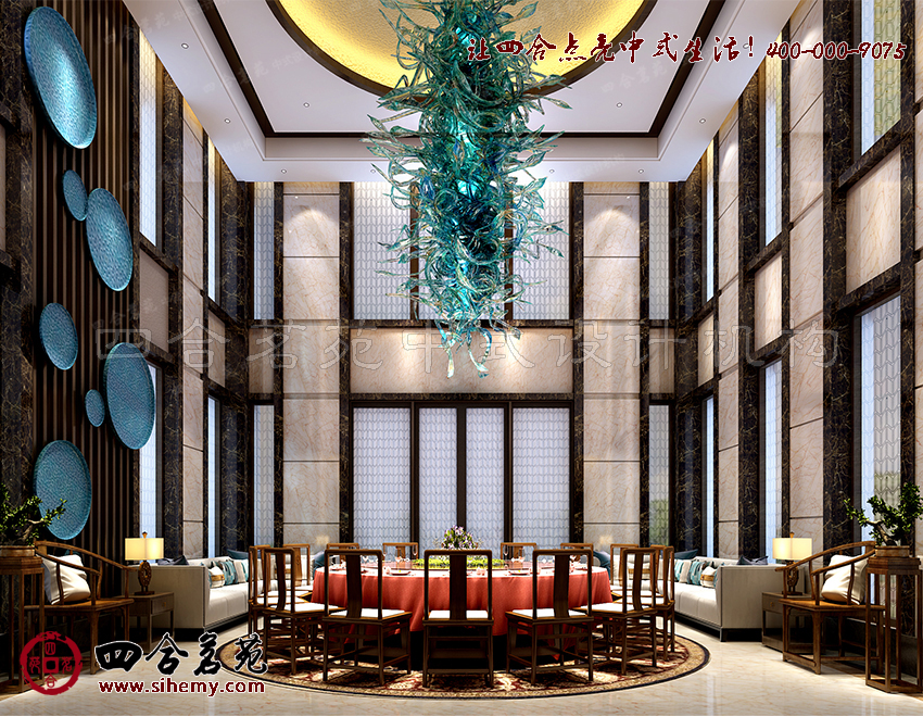 中式別墅會所設計餐廳兼容并包,將中式飲食文化與西式現代藝術美感相結合。寬敞空間中,窗明幾凈,擺放陳設條條有理。天花板倒懸而下的“火樹銀花”使得寬敞空間層次豐富內容充實。大膽的用色,頗具巧思的元素安排,品舌尖美食,觀眼前麗景,真真是“秀色可餐”,叫人大快朵頤。